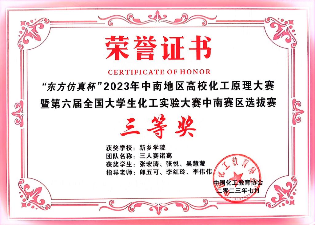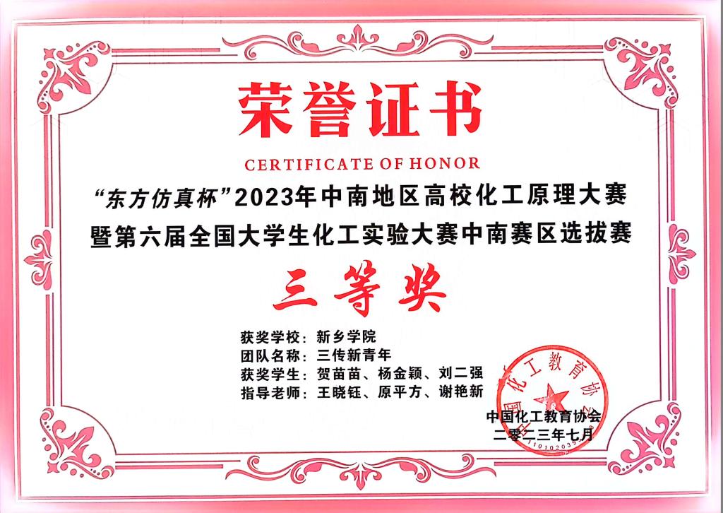 7月10日至13日,由中国化工教育协会主办的“东方仿真杯”2023年中南地区高校化工原理大赛暨第六届全国大学生化工实验大赛中南赛区选拔赛在武汉工程大学举行。大赛共吸引了来自河南、湖北、湖南、福建、广东、海南等中南6省,包括郑州大学、华中科技大学、中南大学、厦门大学、华南理工大学等85所高校的127支队伍参赛。我院贺苗苗、杨金颖、刘二强三位同学组成的“三传新青年”团队和张宏涛、张悦、吴慧莹三位同学组成的“三人赛诸葛”团队分别获赛区三等奖。学生准备和参赛过程由王晓钰、李红玲、郎五可、李伟伟、谢艳新、原平方六位老师指导。