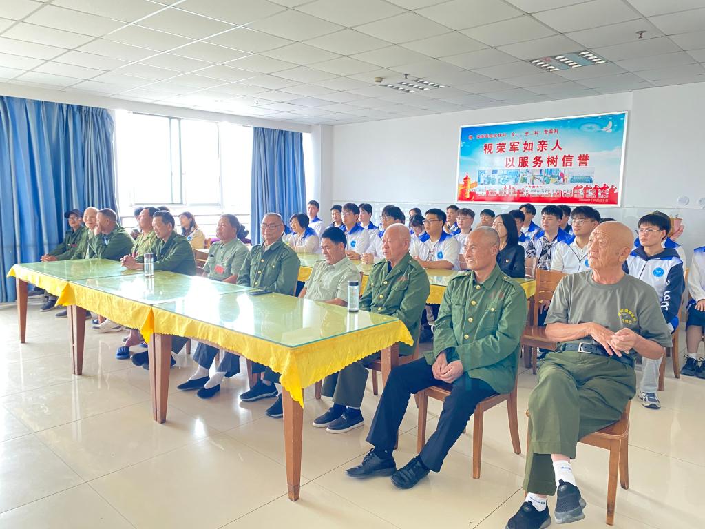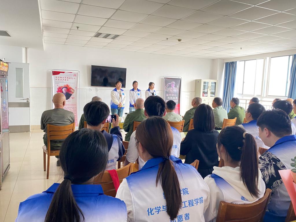 河南省荣军医院是一所综合性优抚医院,主要为伤残的军人、烈士家属及一些退伍老兵提供医疗服务。在荣军活动室,学生代表为抗战老兵们表演了戏曲《朝阳沟》片段和《正派粮草官——肖永正》的长征故事,全体齐唱《我和我的祖国》,致敬为保卫祖国献出青春年华的荣誉老兵,赢得了老兵们的阵阵掌声。