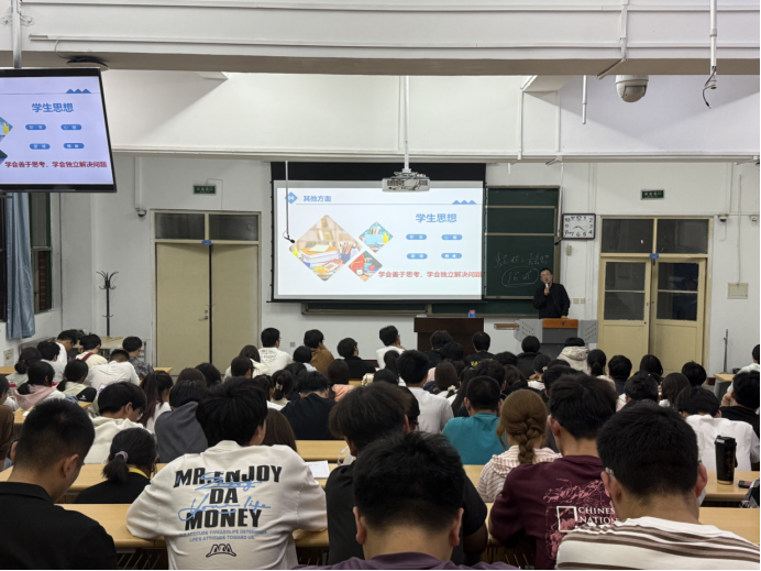 除专业教育外,学院构建全方位育人体系,从思想、生活、安全等多方面为新生保驾护航。在思想引领层面,组织爱国主义红色观影、校史馆参观等活动,引导新生厚植家国情怀、传承校园文脉;在生活适应层面,学工办主任黄琨主讲“规章制度与奖助评优”专题讲座,结合《学生手册》详细解读考勤管理、考试纪律等核心制度,明确行为边界与纪律要求,同时全面介绍校级、院级“三好学生”“优秀学生干部”等评优评先标准及奖助学金政策,以榜样力量激发新生奋发进取的内生动力。