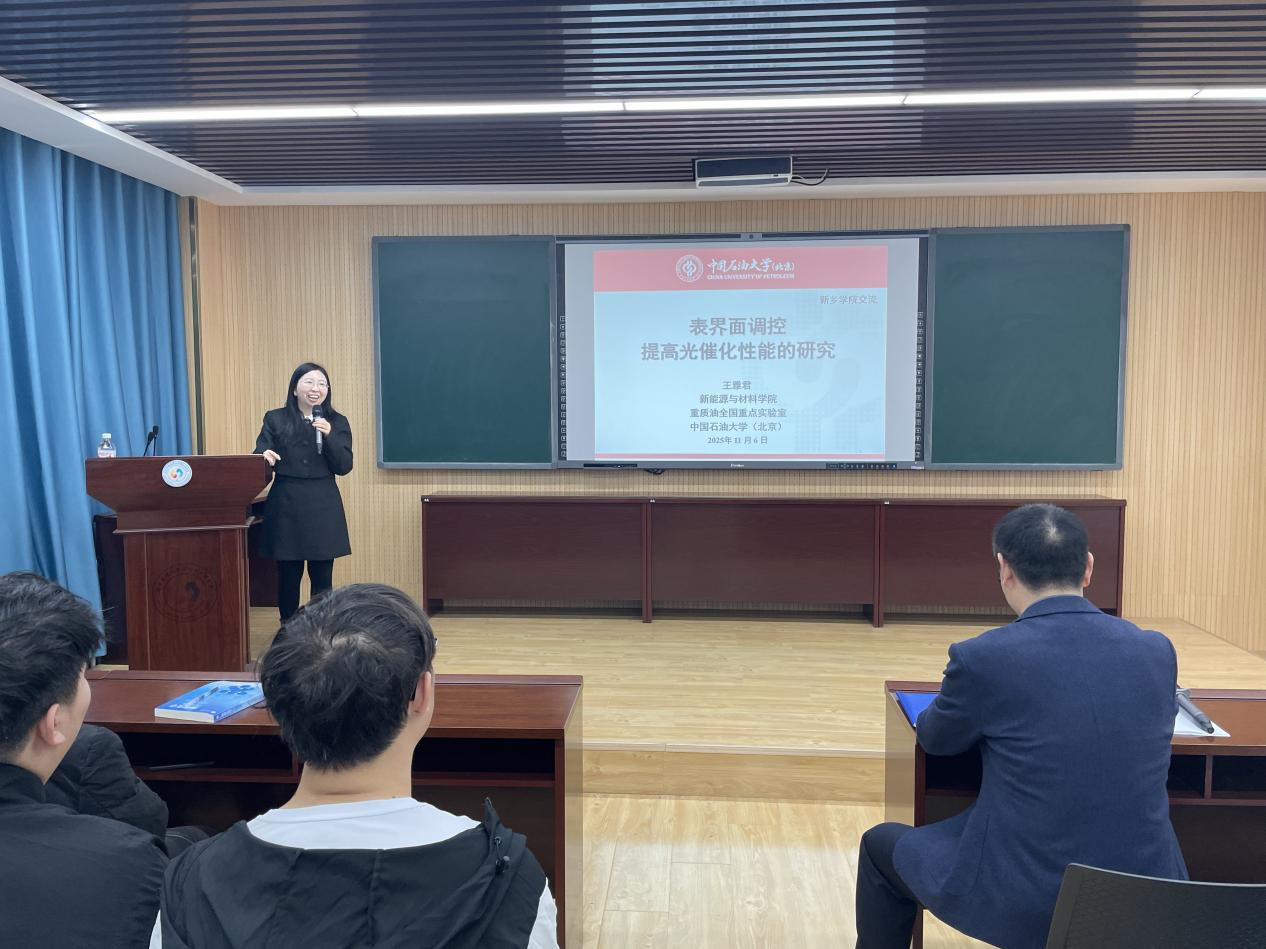 11月6日上午,中国石油大学(北京)王雅君教授应邀在A15-212报告厅作了题为“表界面调控提高光催化性能的研究”的学术报告。yl9193永利集团院长周建伟教授主持报告会,学院青年教师、研究生及本科生代表共100余人参加报告会。