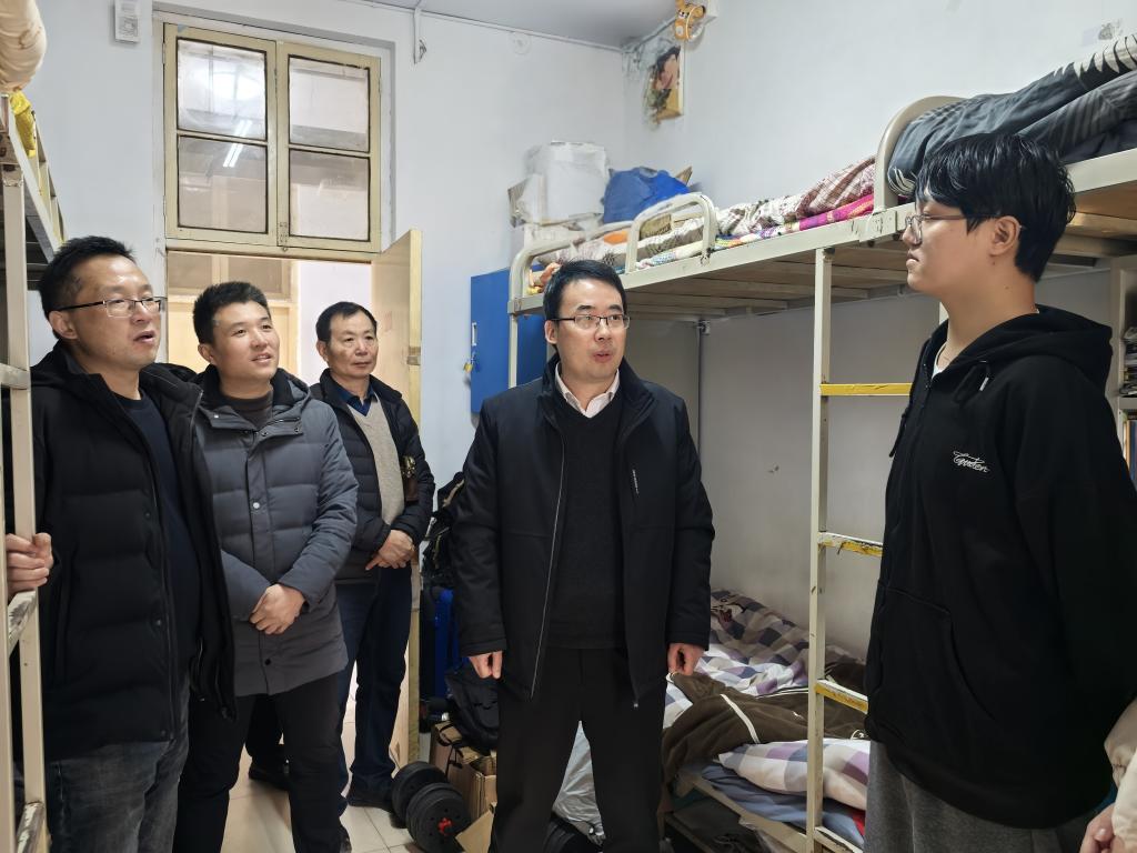 午餐期间,张银堂与刚结束研究生考试的同学们亲切畅谈,细致询问大家的报考院校、意向专业,以及对本次考试难度的直观感受、答题过程中的难点与亮点,认真倾听学子们对考试结果的预期与后续规划,现场交流氛围热烈融洽。随后,他与学院领导一同前往E06学生公寓,先后走进203、228宿舍,与同学们进一步深入沟通,关切询问在校生活细节与学业规划。他勉励大家在学业道路上持续精进,同时针对临近期末的特殊节点,特意叮嘱同学们认真备考、科学复习,力争取得优异成绩。离开宿舍前,他还仔细查看了新增浴室及卫生间的设施配置与使用情况,专门询问同学对新增澡堂的使用感受、实际需求及改进建议。