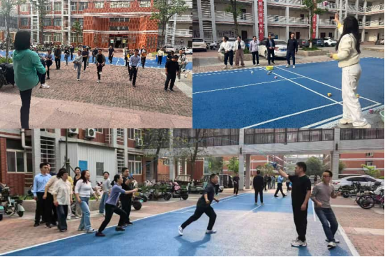 训练现场,老师们围绕智传呼啦圈、毛毛虫大比拼、跳大绳三个团体项目,以及足球射准、沙包投准等个人项目有序开展练习。大家精神饱满、热情高涨,在轻松和谐的氛围中反复演练动作流程、配合协作节奏,充分舒展身体、熟悉赛事规则,以积极饱满的状态为正式比赛做好准备。